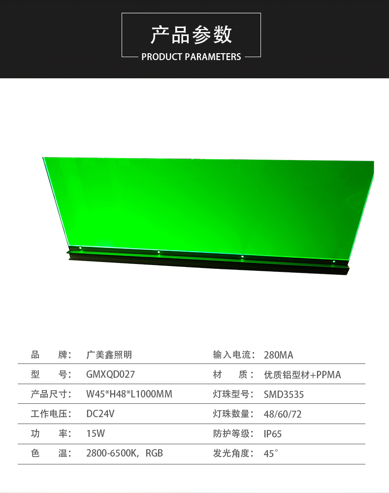 型號(hào) | GMXQD027 | 厚度 | W45*H48*L1000(mm) | 主體材質(zhì) | 鋁型材+PMMA |