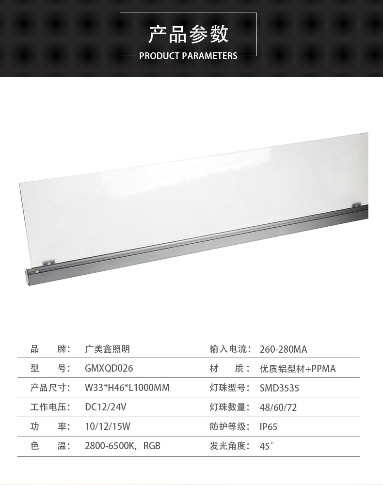 型號(hào) | GMXQD026 | 厚度 | W65*L1000(mm) | 主體材質(zhì) | 鋁型材+PMMA |